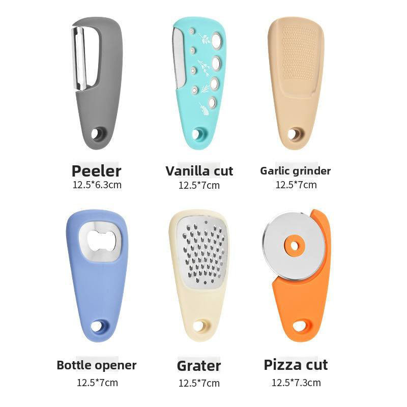 This manual multi-functional kitchen tool set integrates a pizza knife, vanilla knife, bottle opener, grinder, and garlic grinder, meeting the daily needs of Western cuisine, light food preparation, and convenient bottle opening. The tool is made of high-quality materials, sharp and durable, comfortable to hold, easy and effortless to cut, grind and crush, safe to operate without harming hands, suitable for daily use in families.